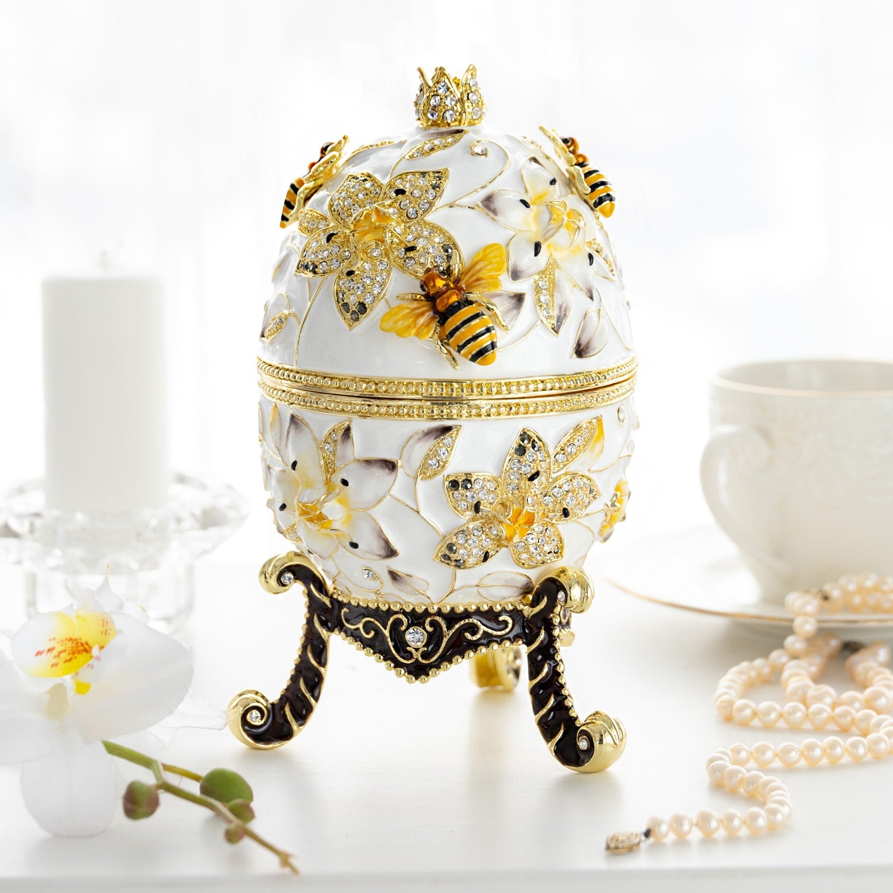 Handmade Faberge-Style Egg Trinket Box, Bees and Flowers
