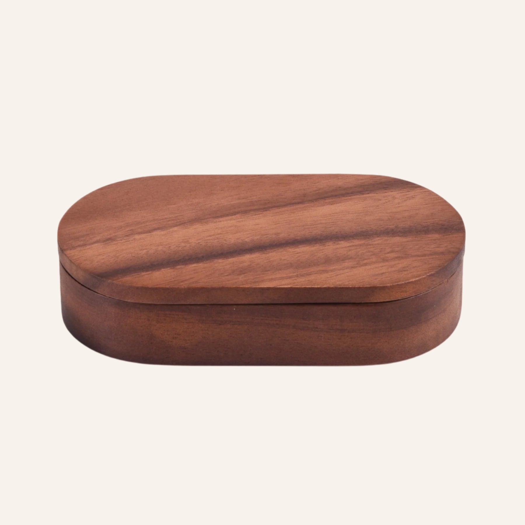 Carved from high-quality acacia wood, this dual-compartment pinch pot is naturally resistant to stains, odors, and bacteria. The rich grain and warm tone of the wood make each piece uniquely beautiful. Whether storing sea salt and pepper or other favorite spices, this container brings both style and function to the countertop.