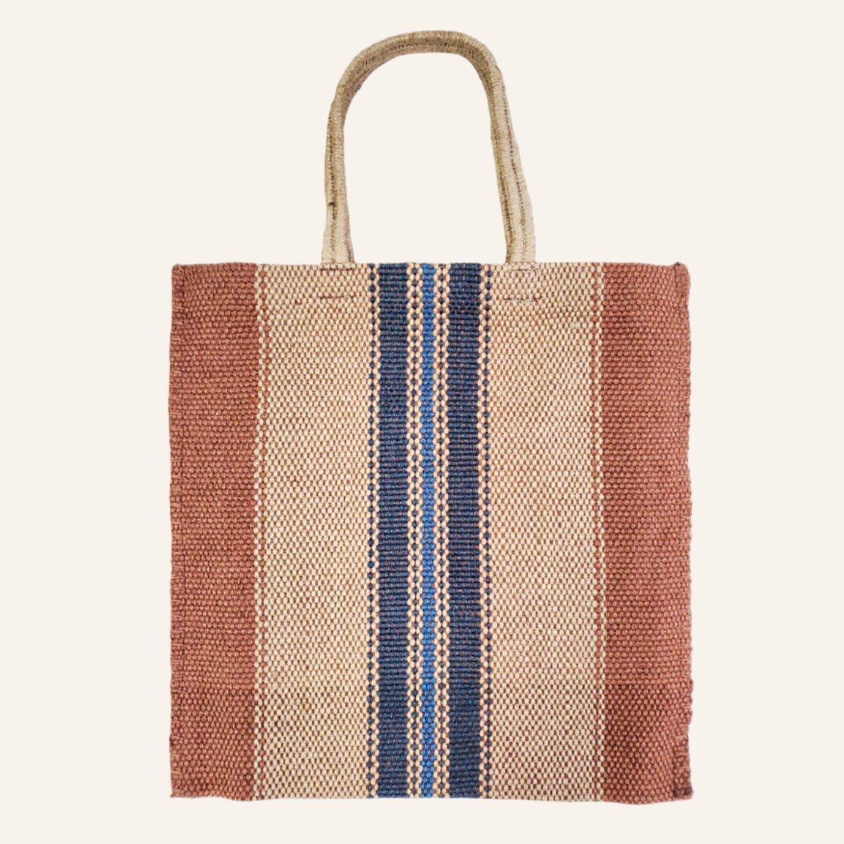 Make a statement with this distinctive hand-loomed and naturally dyed jute bag. Featuring unique rustic fabric, hand-stitched detailing, and vibrant colors, this jute tote bag is your ideal companion for any outing.