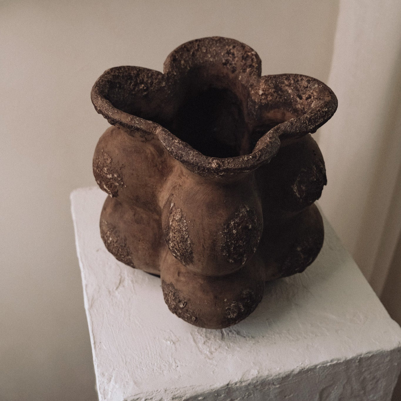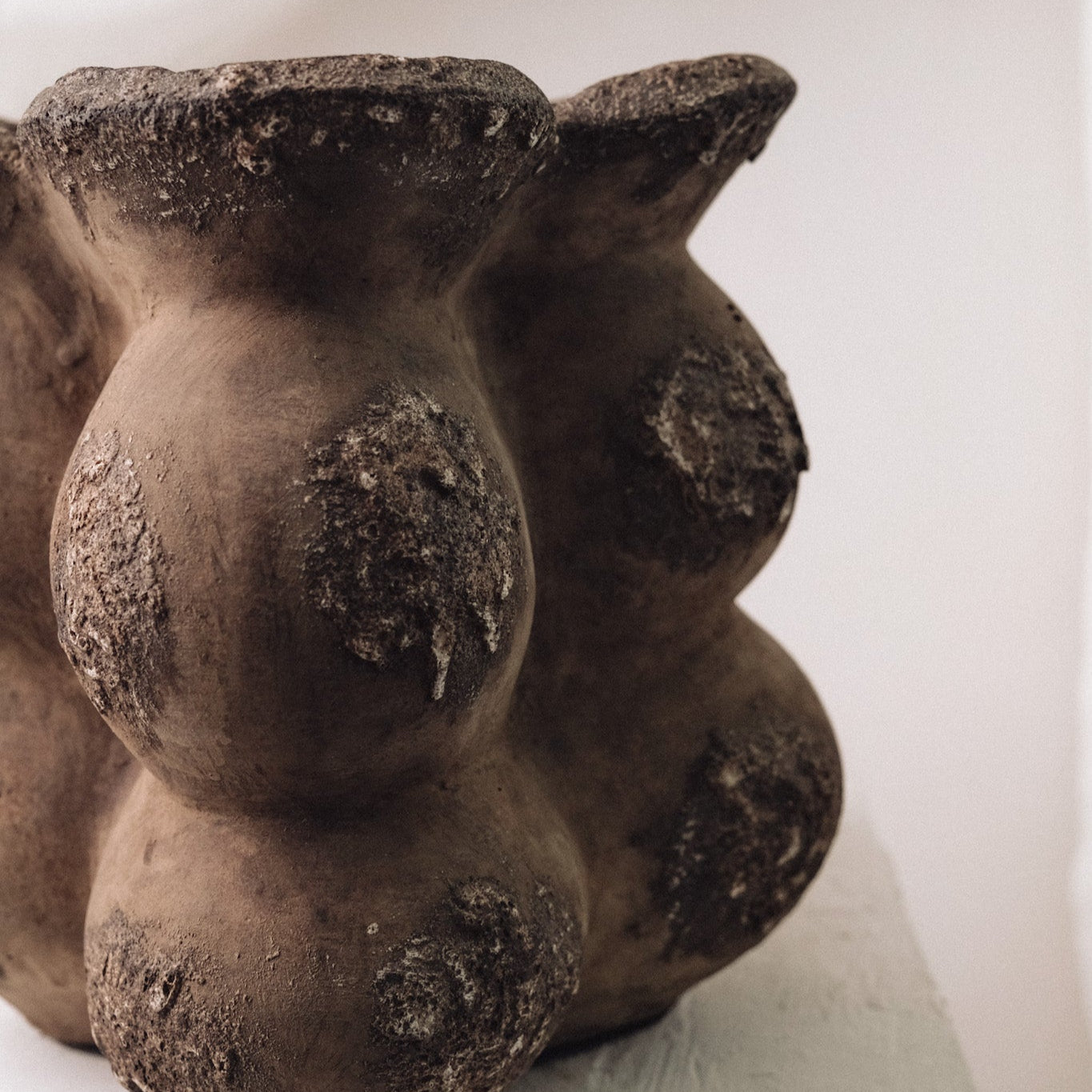 Boldly distinctive and tactile, this handcrafted terracotta vase is a celebration of natural form and traditional Indonesian craftsmanship. Created by skilled artisans, its sculptural cluster design features rounded, bulbous shapes that echo the raw beauty of organic elements. The richly textured finish and earthy brown tones give this piece a grounded, timeworn character—perfect for adding warmth and depth to any setting.