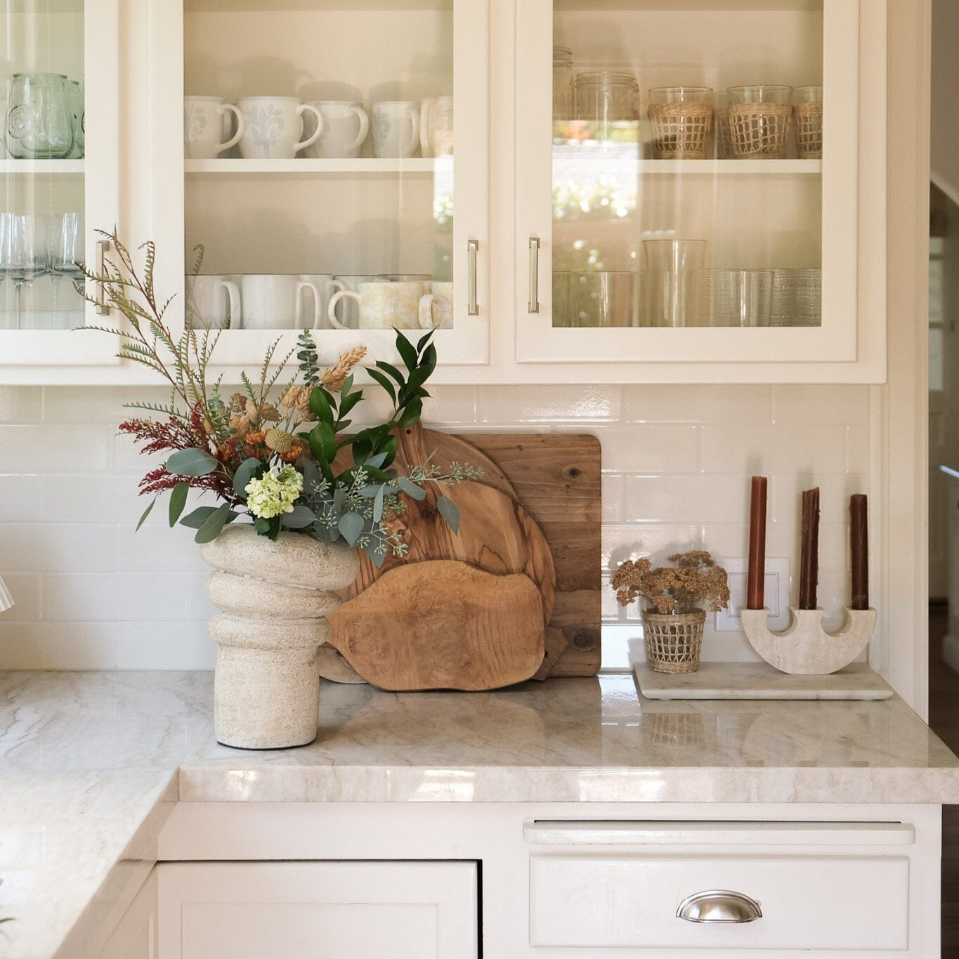 - Layered silhouette adds architectural interest to shelves or tables