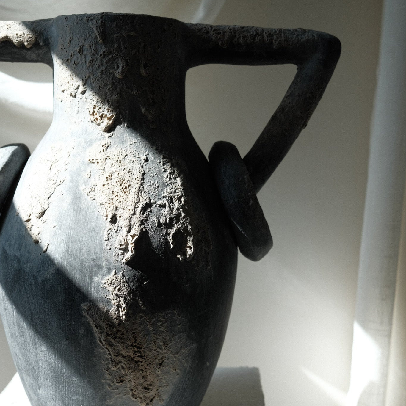 Introduce timeless artistry into your space with this handcrafted terracotta vase, made by skilled artisans in Indonesia. Featuring a distinctive bluish-gray hue and lava-like surface texture, each piece evokes the natural beauty of volcanic stone. Gracefully arched handles and vintage-inspired sculptural details honor heritage craftsmanship passed down through generations.
